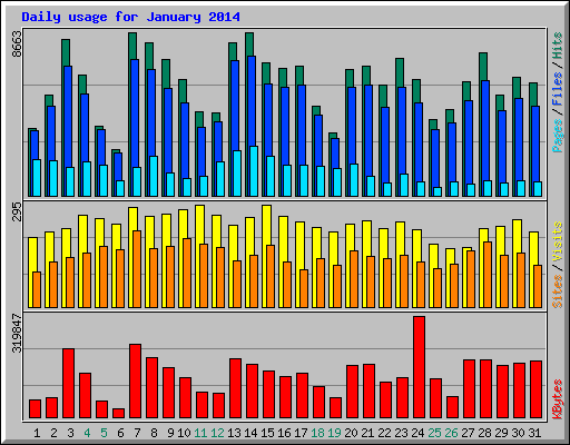 | Day | Hits | Files | Pages | Visits | Sites | KBytes | ||||||